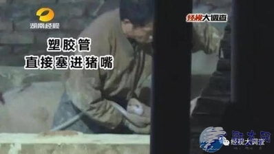 這里竟然是一個(gè)隱藏的灌豬增重的現(xiàn)場,這里一共有三名工人,一人負(fù)責(zé)拿管子往住嘴里塞,一人負(fù)責(zé)打開灌注的開關(guān),另一人負(fù)責(zé)趕豬。