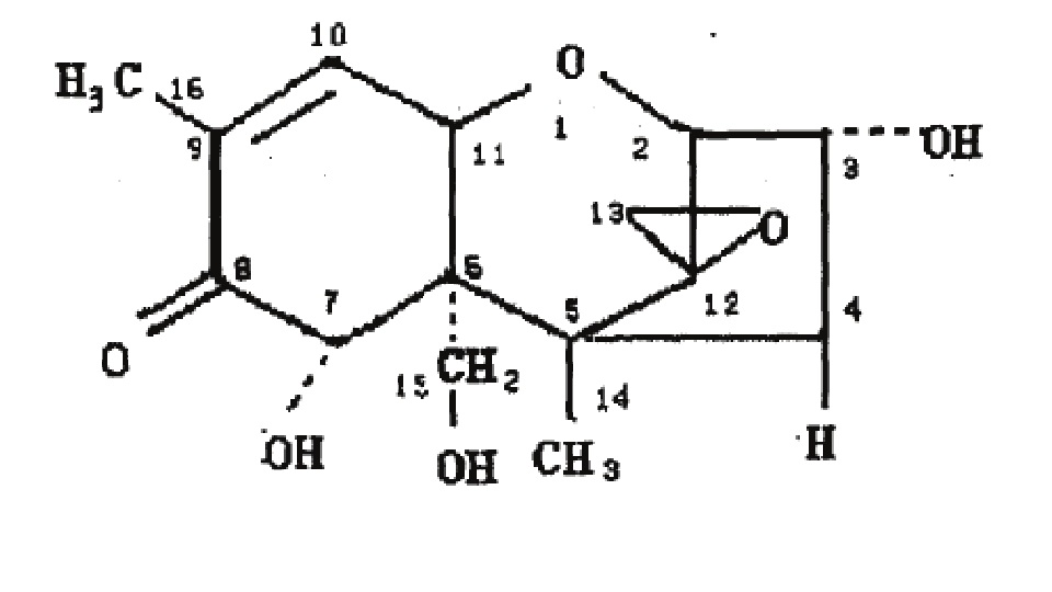 嘔吐毒素是一種單端孢霉烯族毒素,主要由粉紅鐮刀菌和禾谷鐮刀菌產(chǎn)生。其化學(xué)名為3α,7α,15-三羥基-12,13-環(huán)氧單端孢霉-9-烯-8-酮,化學(xué)式為C15H20O6,純品是一種無色針狀結(jié)晶,可在乙酸乙酯和甲醇中長期保存。低劑量的嘔吐毒素,主要引起動(dòng)物食欲下降、體重減輕、代謝紊亂等癥狀,大劑量可導(dǎo)致動(dòng)物嘔吐。嘔吐毒素對(duì)消化系統(tǒng)、血液系統(tǒng)、中樞系統(tǒng)以及鈣磷代謝均產(chǎn)生影響,嘔吐毒素具有慢性和亞慢性毒性、急性毒性、免疫毒性等多種毒性作用。